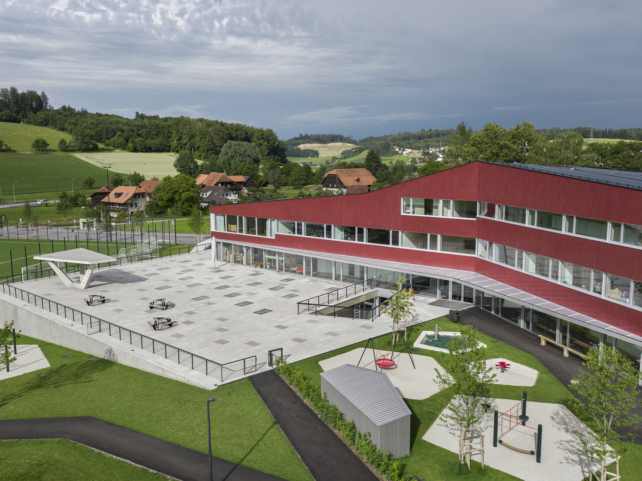 Auf einer komplett grünen Wiese entstehen statt Ackerland drei Basisstufenklassen, eine 3./4. Klasse und eine Tagesschule, sowie eine Sportanlage mit einer Doppelturnhalle und einem Kunstrasen-Spielfeld.